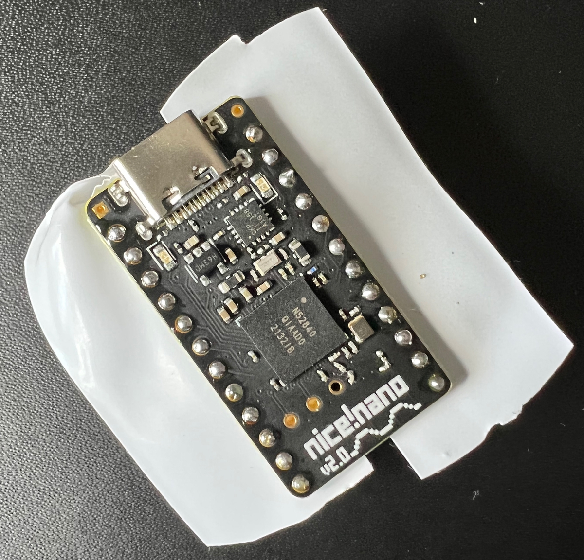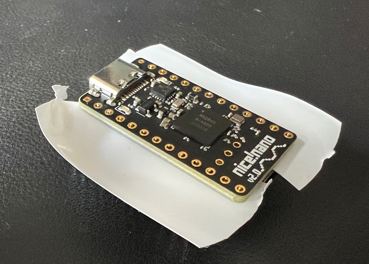 Preparing the nice!nano for soldering. I put some isolation tape in between the nice!nano and the sockets to prevent the solder from leaking in to the socket. This way, the controller is easily removable. A lot of people on Discord let me know they don’t do this and never had any issues, but the last two controllers I socketed did not want to come off after, so better safer than sorrow.