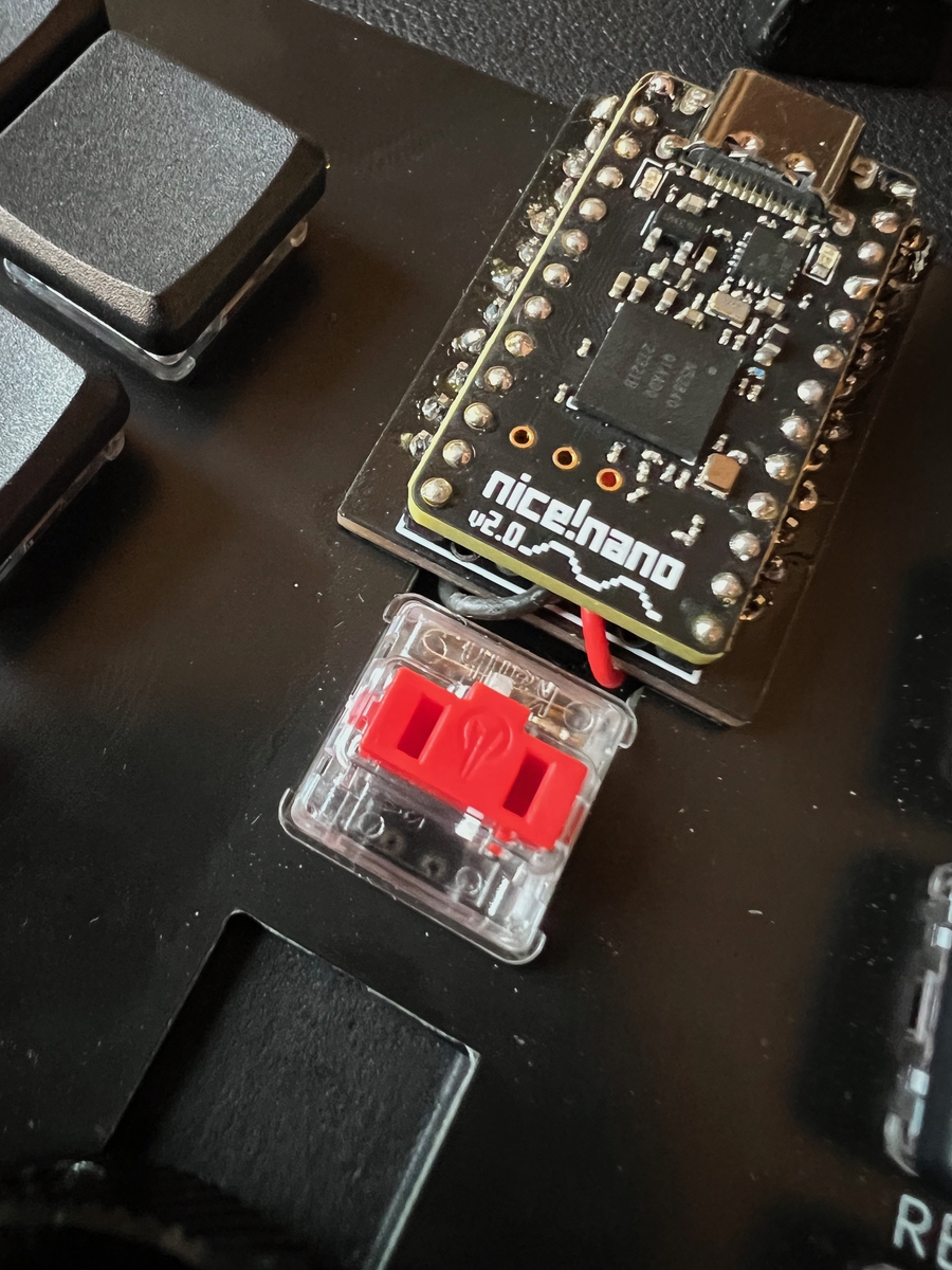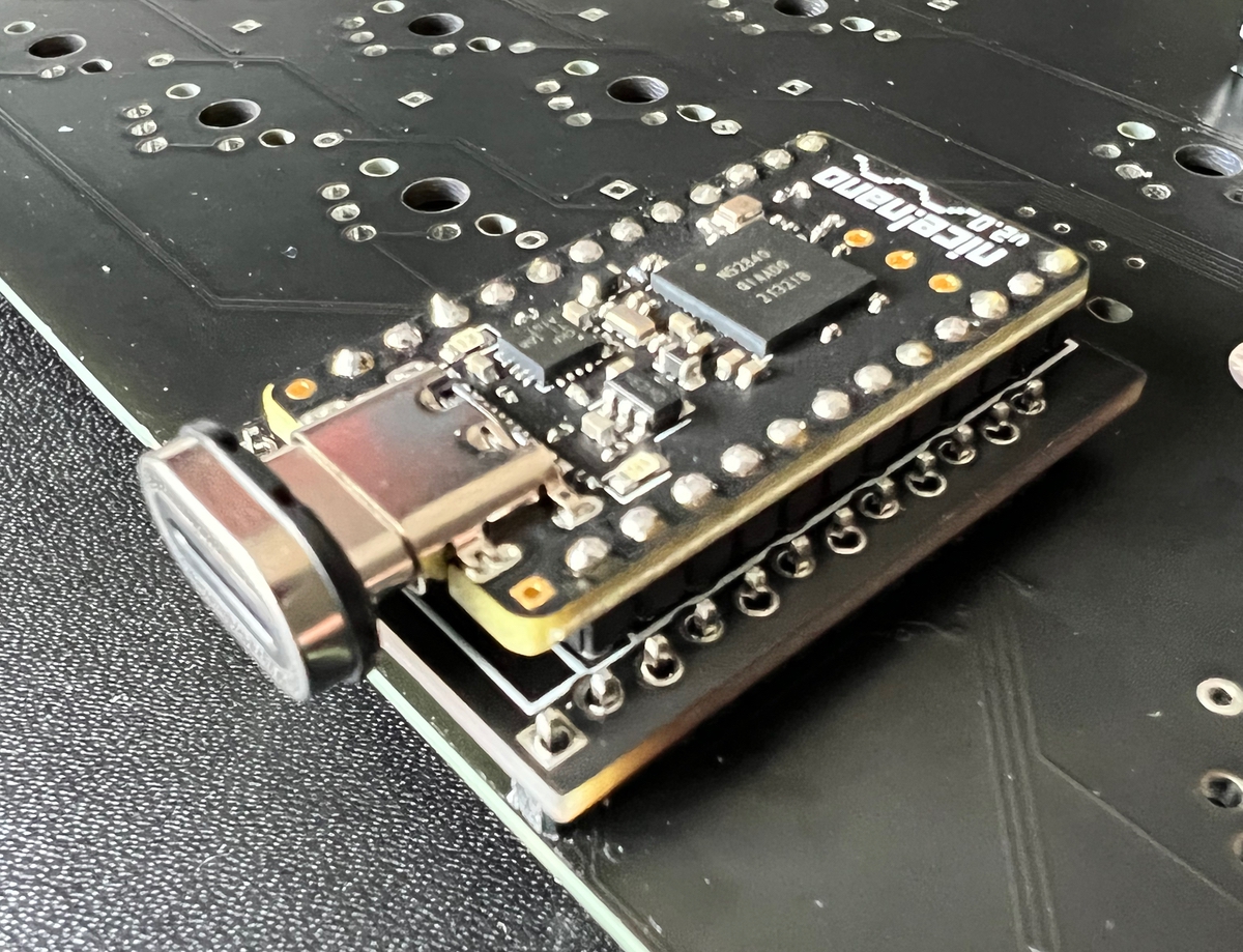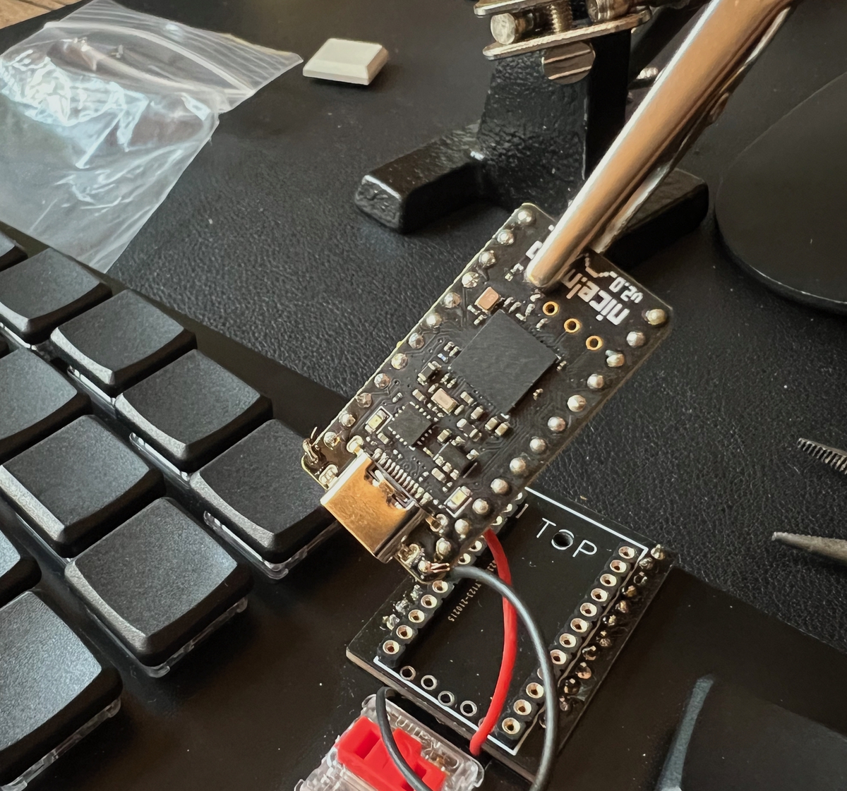 I decided to start by installing the controller because this keyboard does not have native hot swappable switch support. By installing the controller first I could test the PCB first before adding switches save myself a lot of troubleshooting after installing the switches. Because I opted to use a nice!nano I had to use the Small adapter bord (provided by Montsinger) to install my controller on to the keyboard. Many instructions have been written on how to socket your controller, so I’m just going to refer to the How do I socket a microcontroller? by splitkb.com.