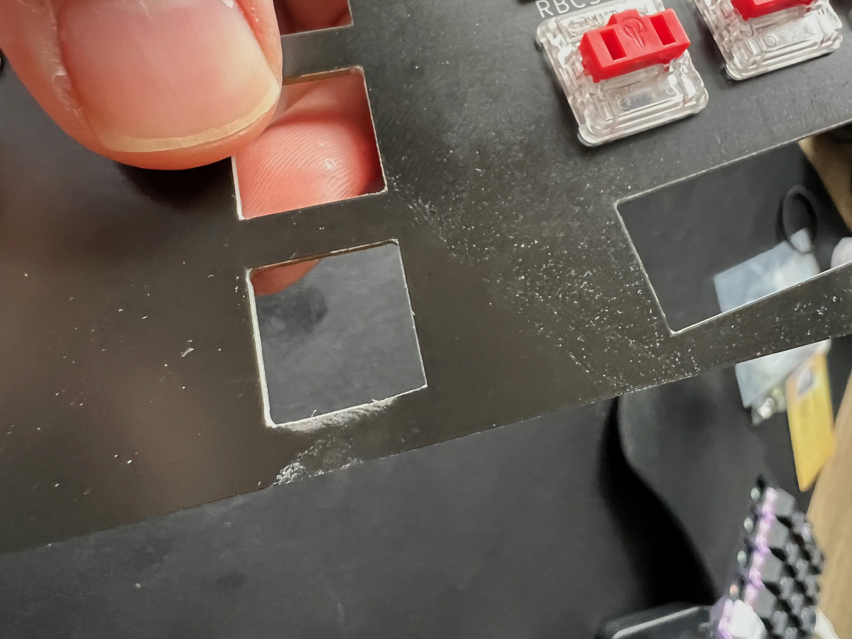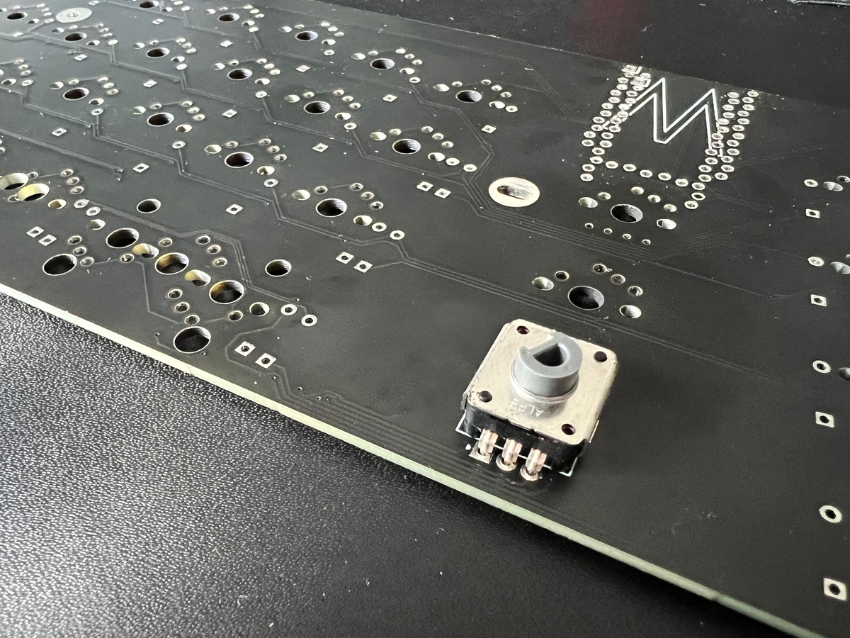 I noticed the plate did not want to align nicely on the PCB after installing the EC12 encoder. To fix this I bent the pins of the encoder inwards after soldering it and I filed down the top plate a bit: