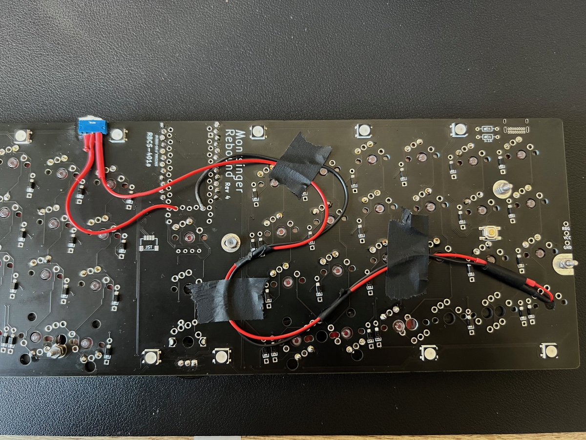 Initially I thought about adding the battery between the plates. But after putting on all the switches I needed I saw that there was a nice space left on the left and right corners of my board. So I decided to but a battery there and route the cables troug a switch hole. I super glued a small on-off switch on the the underside of the PCB to act as a power-switch.
